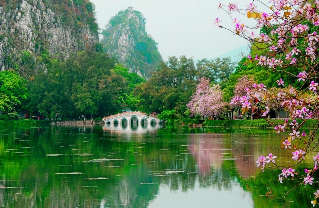 When March comes, Bauhinia variegata are blooming. Flowers covering the branches, rain drizzling and the ethereal scenes where mountains and waters add charms to each other are much more fascinating. Besides, bridges and pavilions above the waters greatly beautify the Seven-Star Cave. The dream-like feelings will even make one feels himself entering the fairyland.