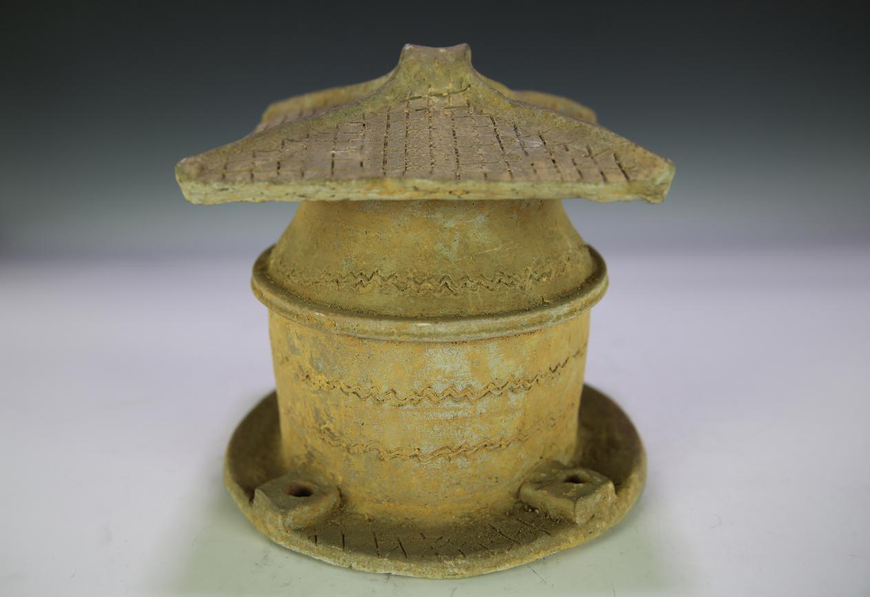 简述 :该藏品于1958年在肇庆西效狮山出土,由白膏泥烧制,火候高,硬度大,因此出土时完整无损,造型较美观、线条流畅。外形为反口,斜肩直肚,平阔底,座有回孔,肩部外有圈,盖为亭形四脊式。