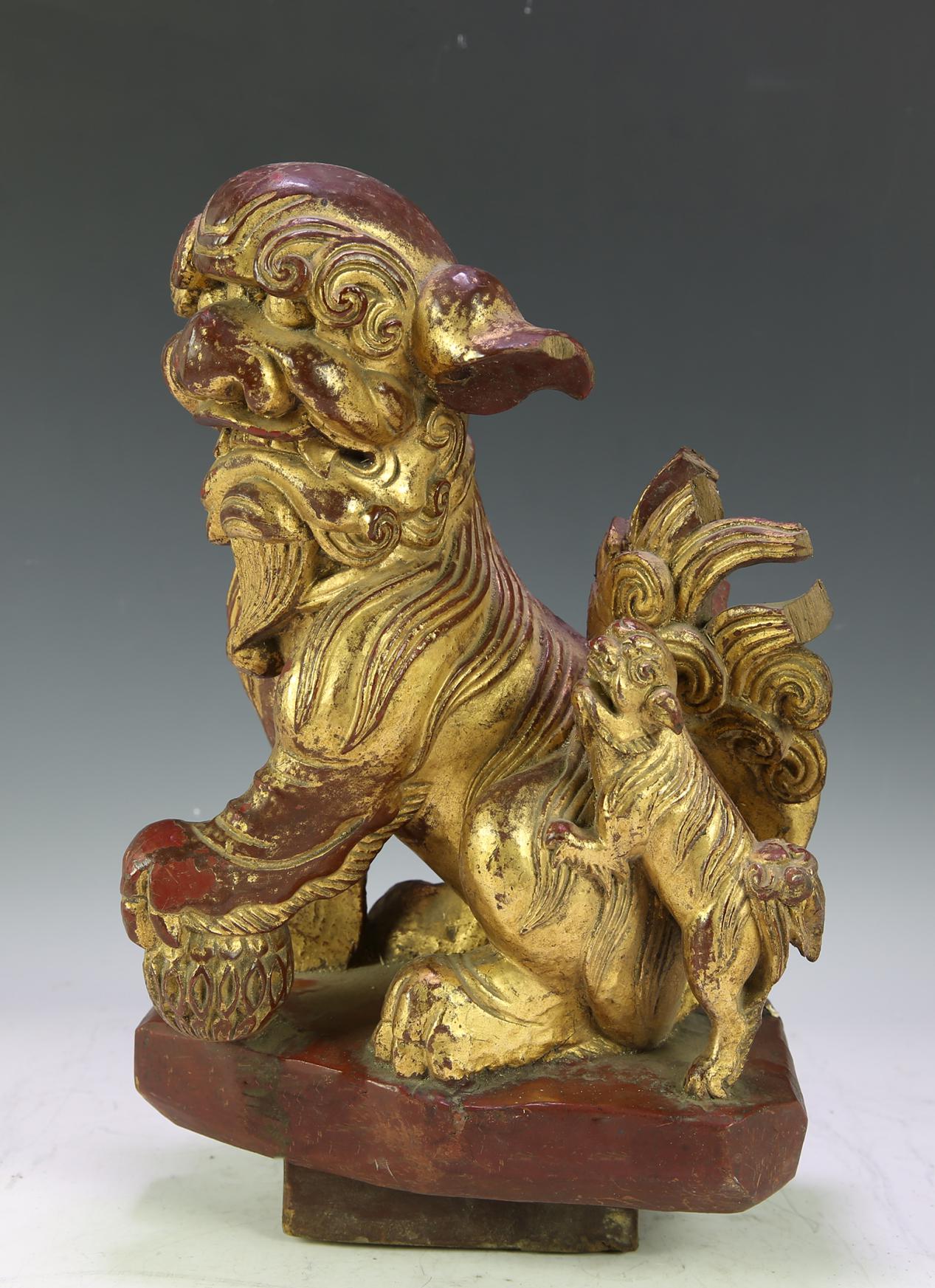 简介: 此件藏品为贴金圆雕狮子形。仰首侧身,尾部耸起,足爪刚劲有力,右前脚踏金球,旁有小狮趴于身侧,作品形象生动威猛。