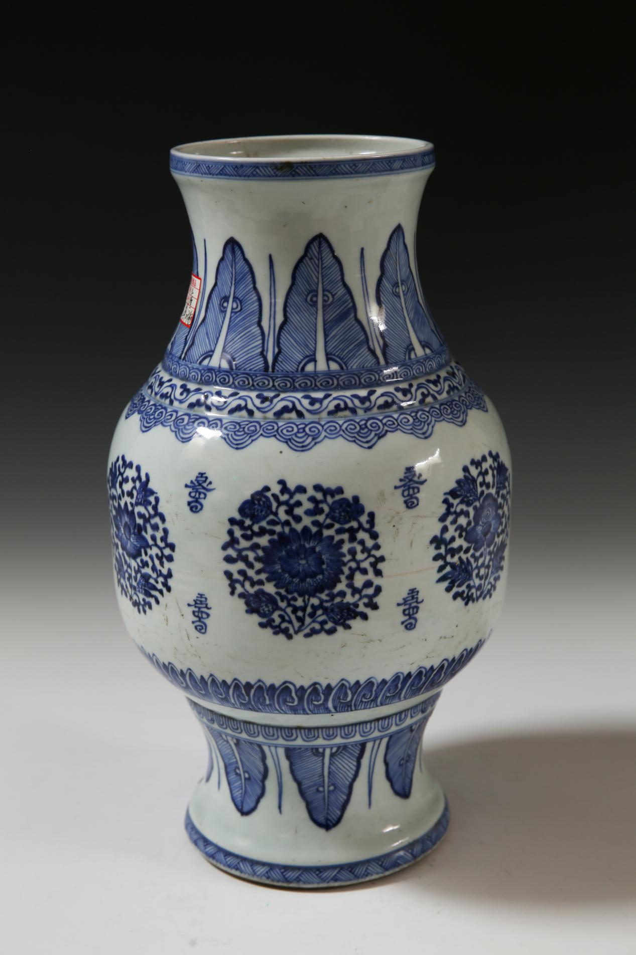 :该瓶为圆形直口,圈足稍外撇。颈中绘蕉叶纹一周。瓶身绘团花寿字图。造型独特,纹饰精致。