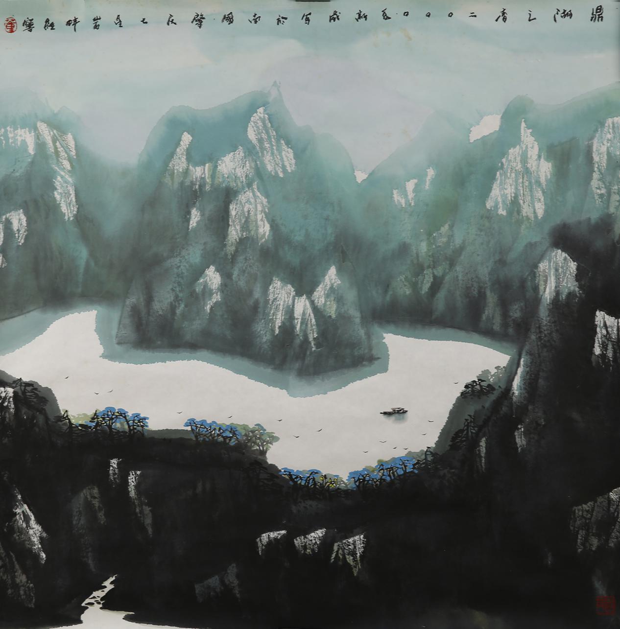简介: 此图为纸本,设色,镜心。图中所绘为鼎湖山之景:群峰环绕着一湾湖泊,湖中有小船游荡,空中雀鸟盘旋。图上方有款,款左有阳刻朱印一枚。