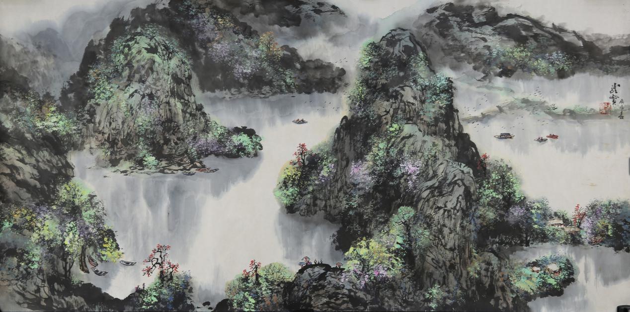 简介:此图为纸本,设色,镜心。该画将七星岩七座岩山尽收纸上,山恋秀美,湖中倒影重重,游船三五,莺飞花绽。画风独特,中西相溶。
