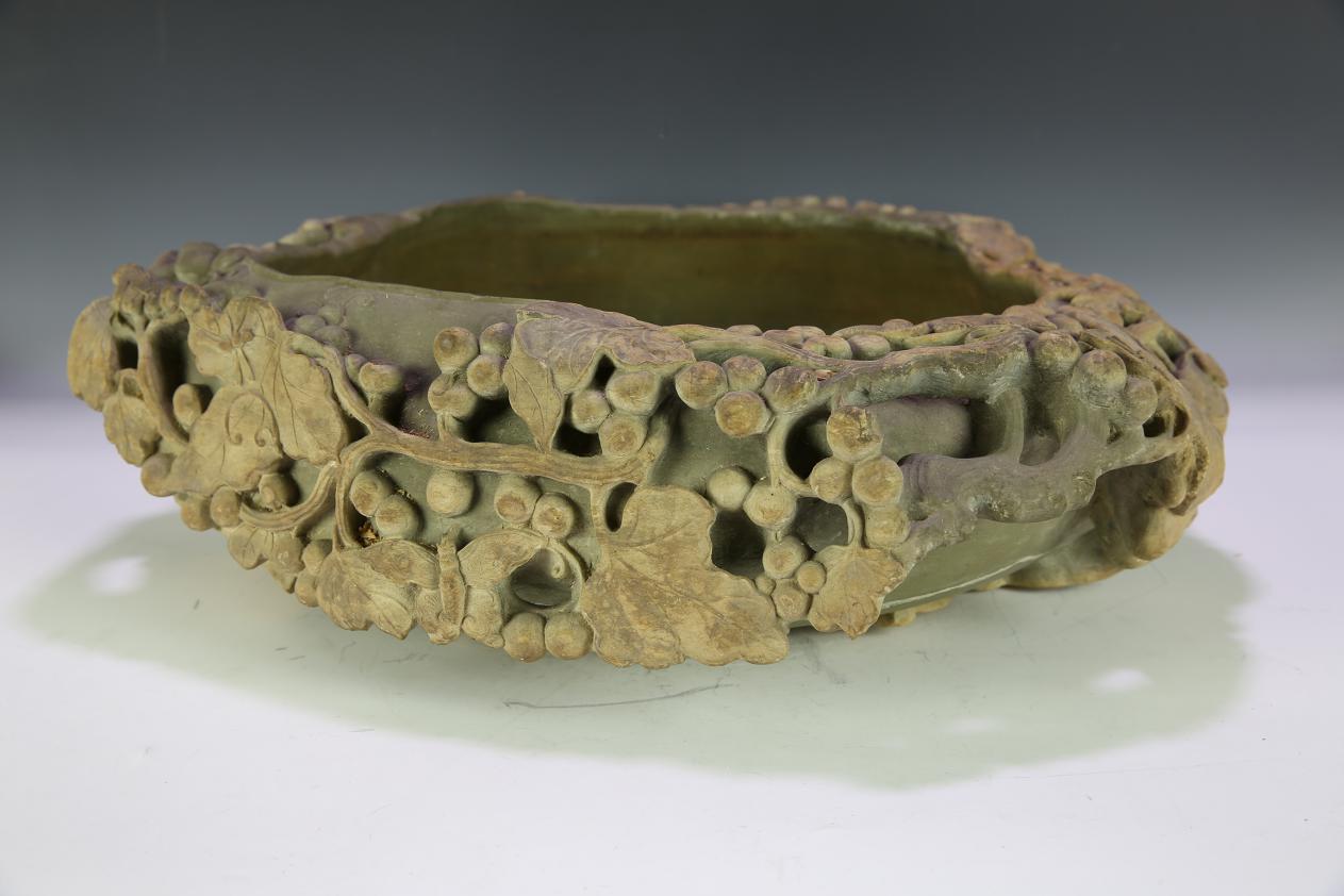 :该品为不定形,石质为绿端石,四面镂雕葡萄蝠鼠,可用做笔洗。
