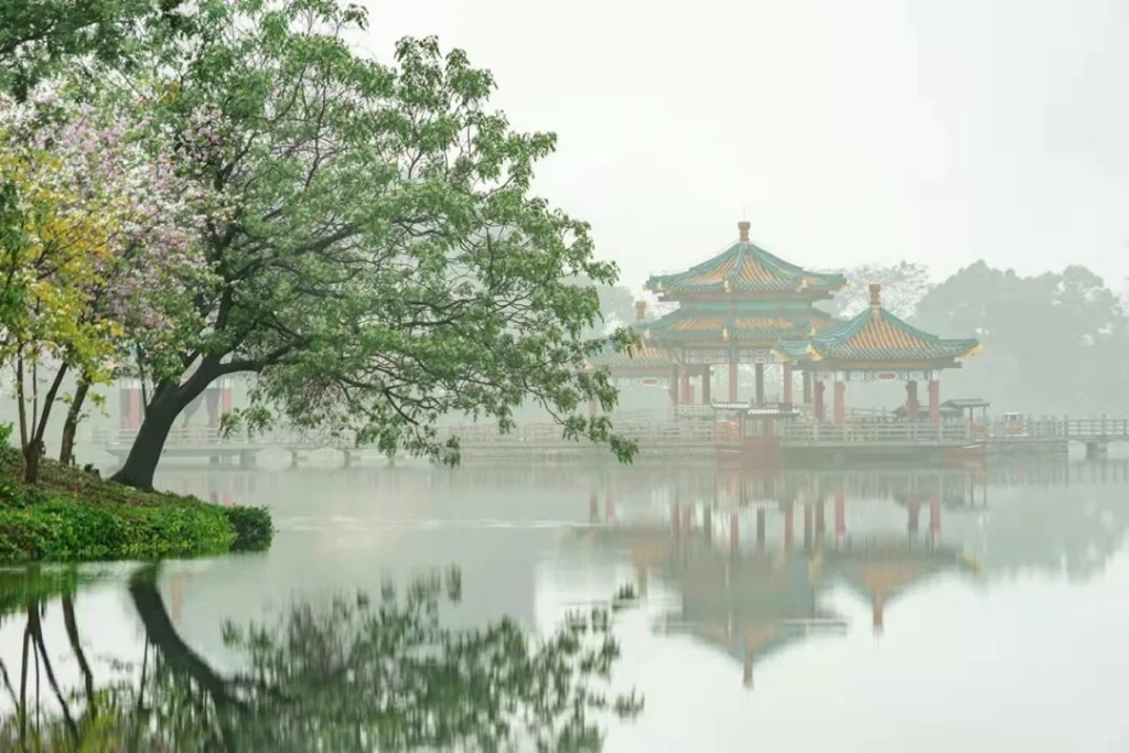 在天气多变的春节 雨便是星湖的一道特别的风景 烟雨入星湖,山水如墨染的飘渺画面 在这里都是寻常景象