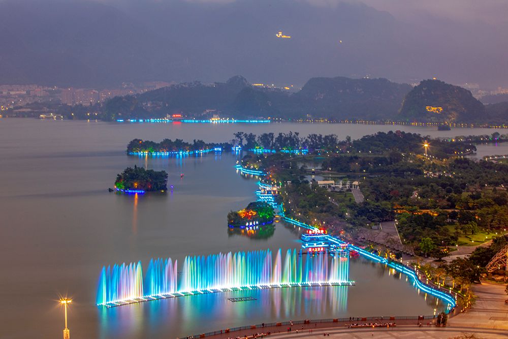 下了一场雨 七星岩是打翻调色盘了吗? 嫩绿的落羽杉林 粉红的宫粉紫荆花带 青山绿水的星湖 美得让人叹为观...