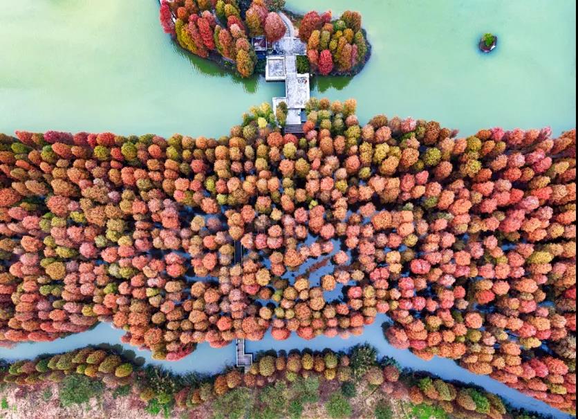 北方有红叶 南方则有落羽杉红 落羽杉叶春天翠绿 秋天开始变黄 入冬转为艳红 最后转为红褐色 非常迷人