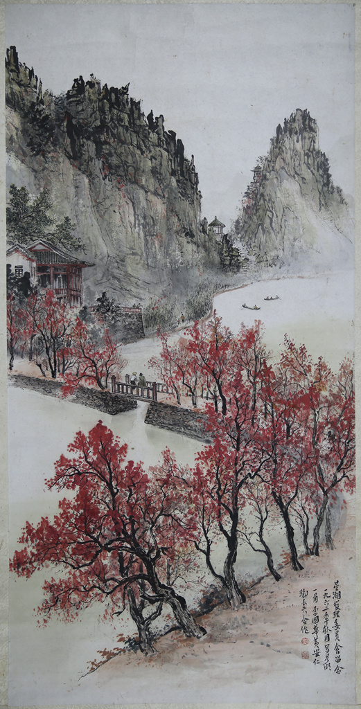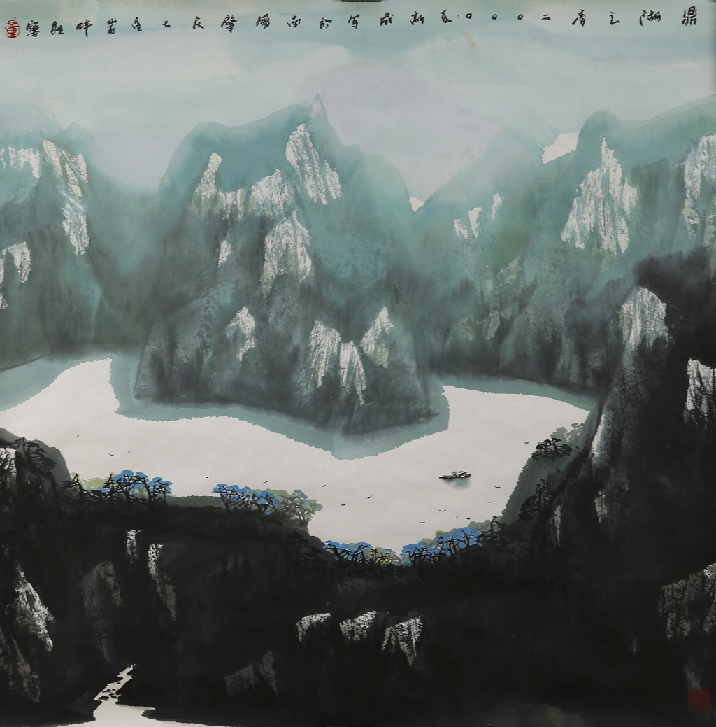此图为纸本,设色,镜心。图中所绘为鼎湖山之景:群峰环绕着一湾湖泊,湖中有小船游荡,空中雀鸟盘旋。