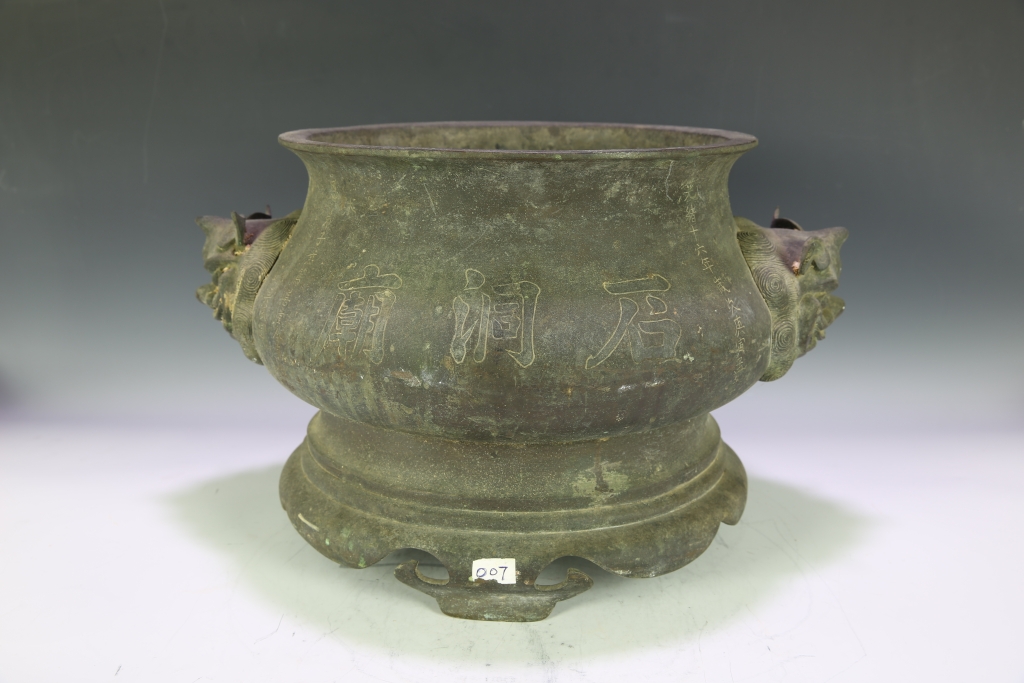 圆形反口,斜肩鼓腹,修胫,圈足有如意图案,两侧铸双兽耳。腹部有“石峒庙”的铭文。该炉原于清光绪十六年...