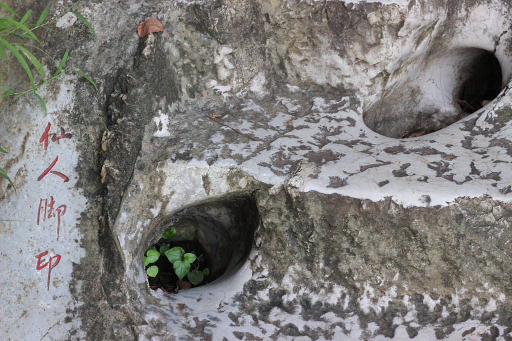 在三仙观后的登山道中,有两个溶洞,一大一小,一深一浅,一竖一斜,因其恰似人的脚印,所以称仙人脚印。